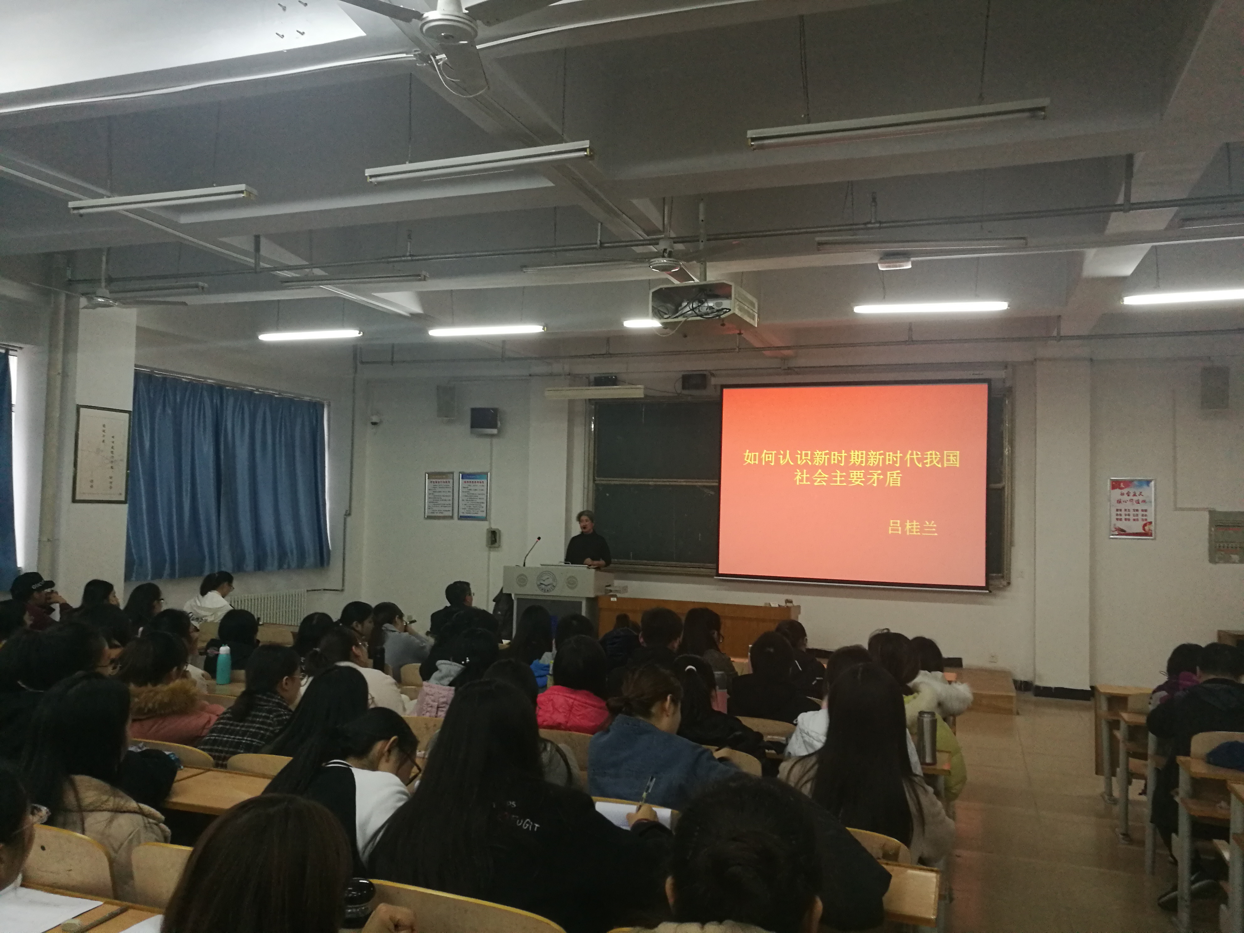吕桂兰老师以如何认识新时期新时代我国社会主要矛盾为主题,从寻找道路、目标任务和历史使命等方面深入浅出的分析了新时期与新时代的区别;运用矛盾分析法深刻阐述了新时期新时代我国社会主要矛盾的具体体现;深刻解读了党的十九大报告提出的新时代我国社会主要矛盾已经转化为人民日益增长的美好生活需要和不平衡不充分的发展之间的矛盾,这一重大判断的现实意义;最后,吕桂兰老师勉励金年会jinnianhuicom大学生要结合自身的学科优势,在互联网+、大数据、人工智能科技高速发展的时代背景下,抢抓机遇、迎接挑战,将创新精神融入未来朝阳产业中,改善行业发展不平衡不充分的现状,为实现人民对美好生活的向往而努力奋斗,把报效祖国、造福人民、建功立业作为自己人生的崇高理想。
