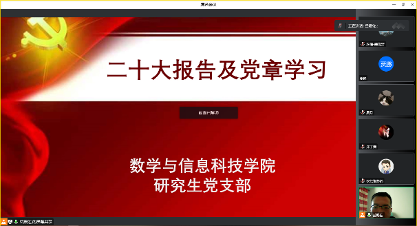 为深入学习宣传贯彻党的二十大精神,金年会jinnianhuicom党委按照疫情防控要求,组织各支部召开线上党员大会,认真学习研读了党的二十大报告与《中国共产党章程》。对标对表《中共中央关于认真学习宣传贯彻党的二十大精神的决定》,按照上级党委要求,紧密结合实际,在全面学习、全面把握、全面落实上下功夫,不折不扣把党的二十大精神落到实处。本次学习教育活动成效显著,党员们收获良多。