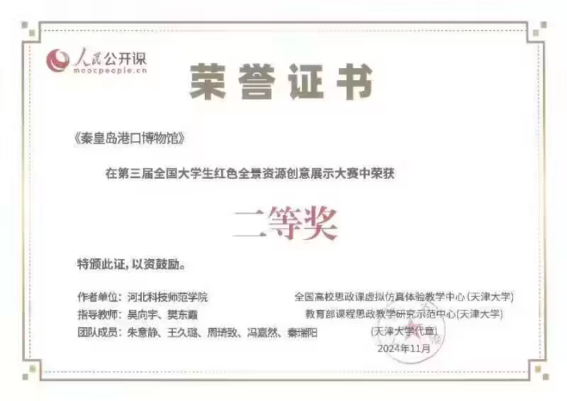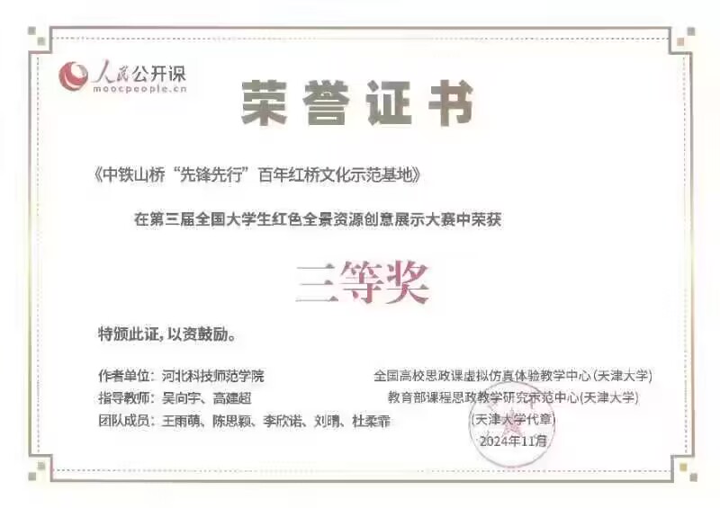 近日,第三届全国大学生红色全景资源创意展示大赛结果公布。 21级数字媒体技术专业朱意静团队的作品《秦皇岛港口博物馆》获得二等奖,22级数字媒体技术专业王雨萌团队的作品《中铁山桥“先锋先行”百年红桥文化示范基地》获得三等奖。