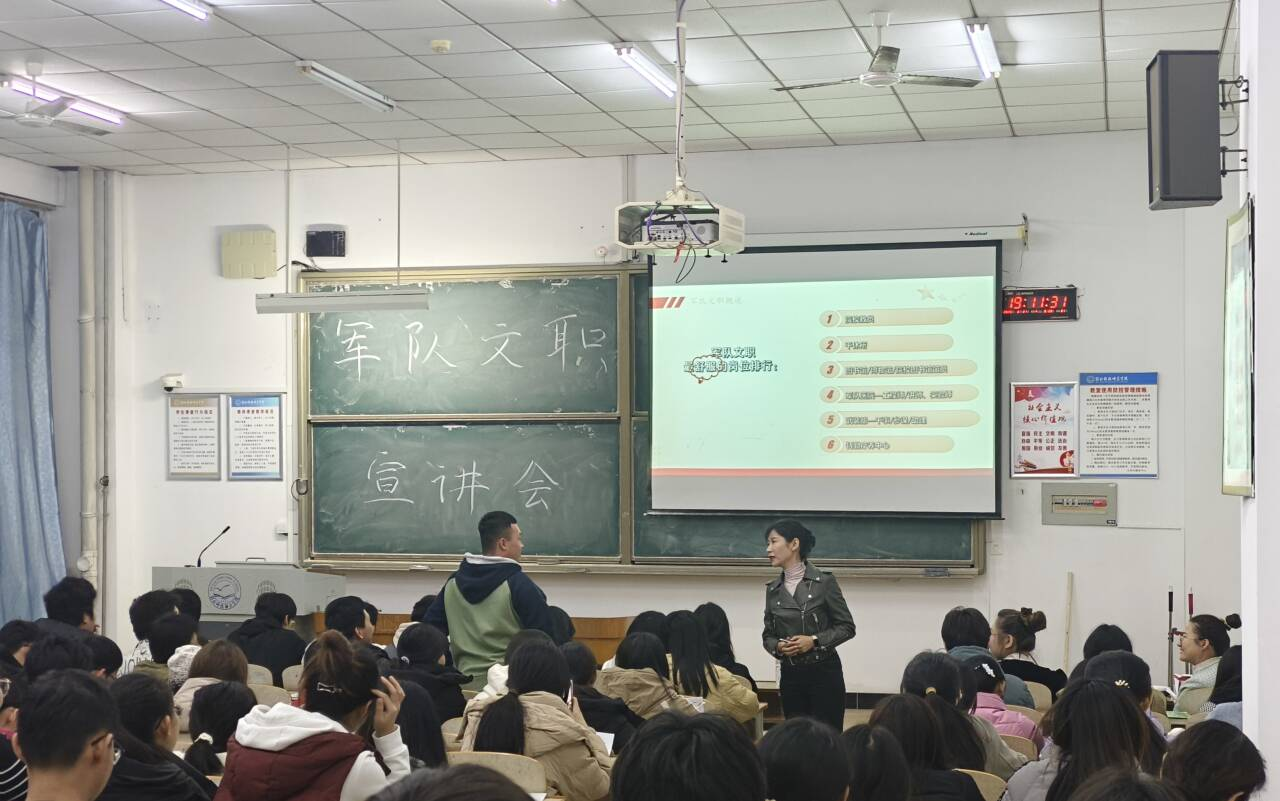 为了让同学们对军队文职人员岗位有更加深入的了解和体会,2024年11月21日金年会jinnianhuicom邀请了专家在逸夫楼A103开展军队文职宣讲会。