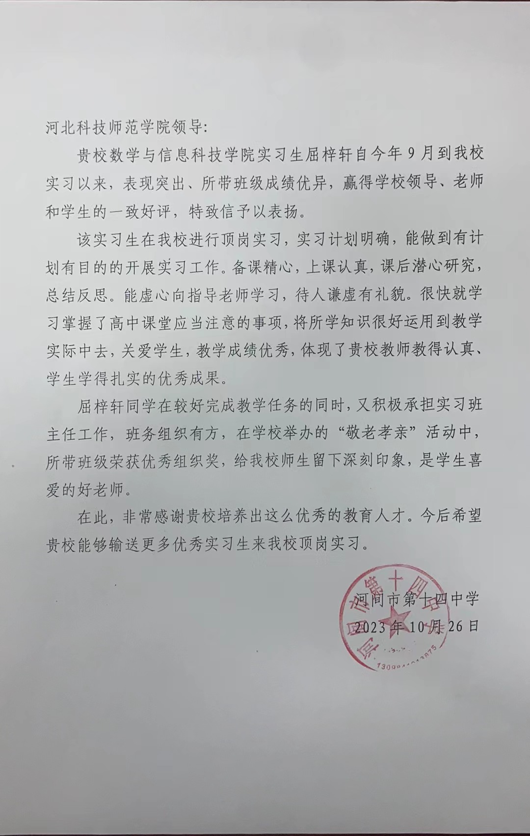 近日,河间市第十四中学向金年会官网发来表扬信,对金年会jinnianhuicom数学与应用数学专业屈梓轩同学自今年9月到河间市第十四中学教育实习以来的表现予以表扬。