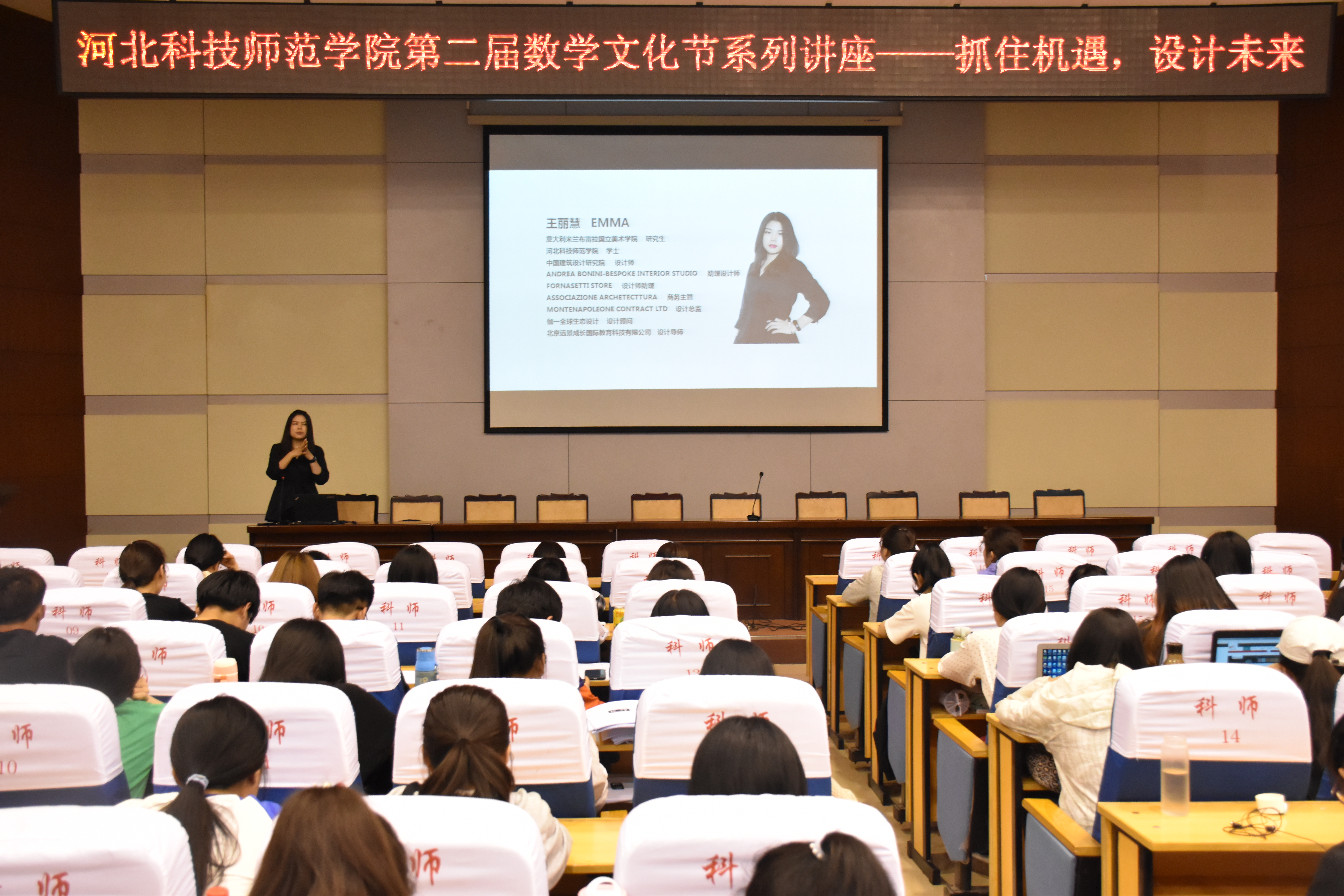 2019年5月16日下午,金年会jinnianhuicom在秦皇岛校区学术交流中心举办了学校第二届数学文化节系列讲座。特邀中国建筑设计研究院设计师王丽慧作题为“抓住机遇,设计未来”的专题报告,金年会jinnianhuicom的数学与应用数学、应用统计、计算机科学与技术、数字媒体技术等各专业师生400余人聆听了此次专题报告。