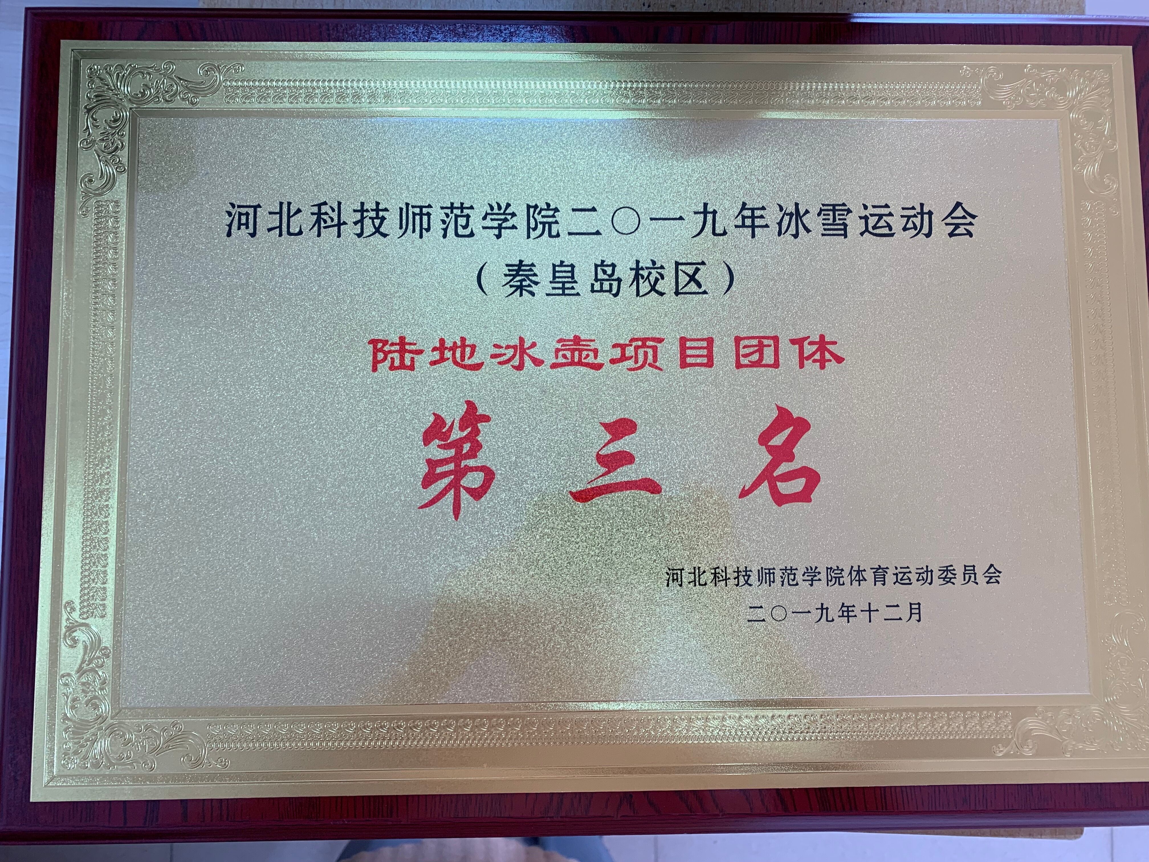 为贯彻落实习近平总书记重要指示和落实省委、省政府关于冰雪运动发展批示精神,喜迎2022北京冬奥会、大力普及冰雪运动。2019年12月5日,学校在秦皇岛校区隆重举办首届冰雪运动会。进一步激发广大师生参与冰雪运动的热情,增强冰雪健身意识、提升身体素质,扩大参与冰雪运动的群众基础,营造全校积极参与冰雪运动的良好氛围。金年会jinnianhuicom派队在秦皇岛校区参加了学校首届冰雪运动会,陈亚杰、万君霞、梁一凡等16名同学组成了两个代表队代表金年会jinnianhuicom参加了比赛。冰雪运动会比赛项目有陆上冰壶,100m、200m、400m以及全能轮滑。天气虽然寒冷,但在同学们此起彼伏的加油助威声中,参赛选手全力以赴,最终金年会jinnianhuicom冰壶二队取得了秦皇岛校区第三名的好成绩,呈现出了金年会jinnianhuicom学子健康阳光、拼搏进取的新一代青年大学生风采。同时,金年会jinnianhuicom被学校授予精神文明单位荣誉称号。