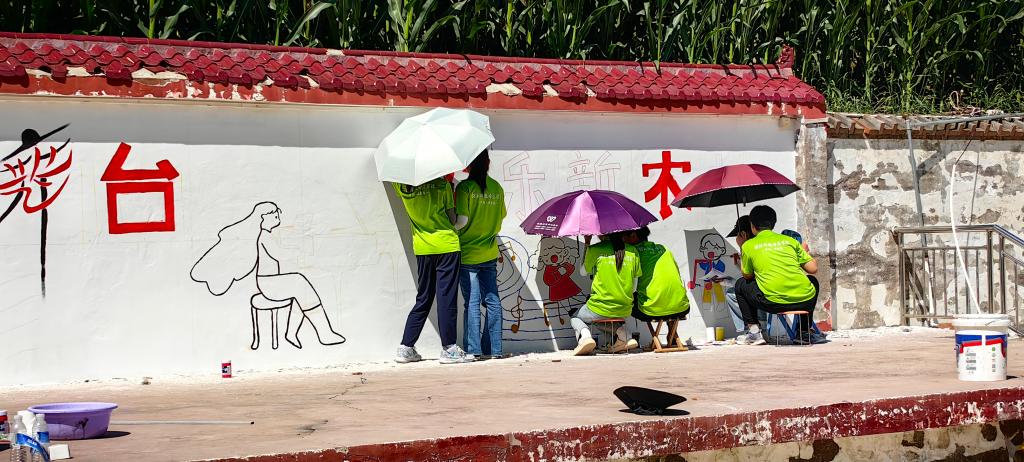 实践团创新墙绘内容,以社会主义核心价值观、中华优秀传统美德作为艺术墙绘的创造素材,运用专业知识绘制特色墙绘图纸,对当地墙体进行考量,为当地设计特色墙绘。打草稿、刷漆上色、细节刻画、收尾调整……实践队员在带队教师的精心指导下分工协作,运用绘画、书法、设计等专业技能,以墙绘艺术的形式,用青春的画笔绘制出乡村振兴的美好蓝图,将艺术创作融入乡村文化生活,让艺术美与乡土情充分结合,用艺术为乡村赋能,用行动助力乡村振兴。