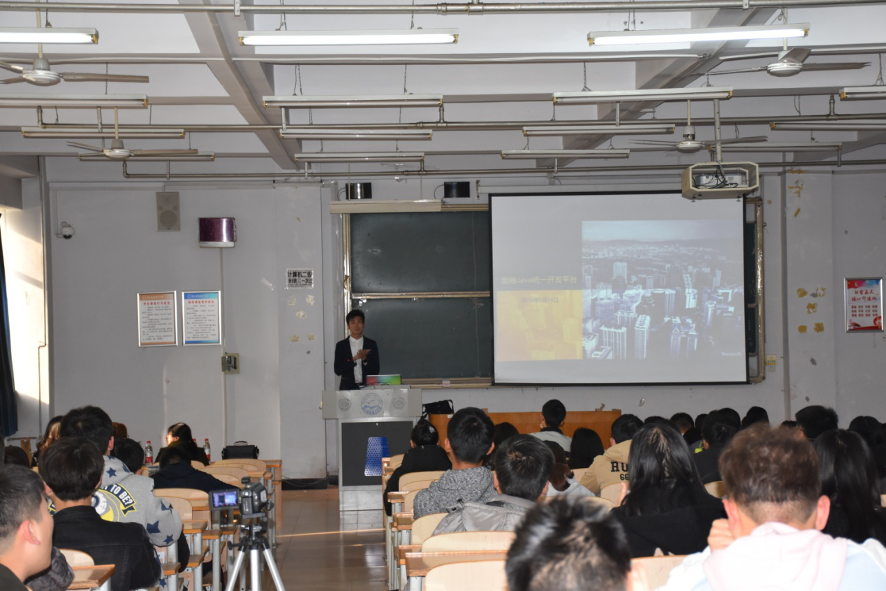 2017年10月30日,金年会jinnianhuicom特邀请东软睿道公司的高级软件工程师王悦先生来金年会官网为学生们进行了题为《基于软件工程生命周期的全民飞机大战项目分析与开发》的讲座。网络工程15级和计算机科技17级的学生参加了此次讲座。王悦先生在报告中讲解了企业实际开发软件的生命周期与概况,并详细介绍了游戏软件的开发流程。学生通过此次习,将课堂上所学到的理论知识与企业的实践相结合,受益匪浅。