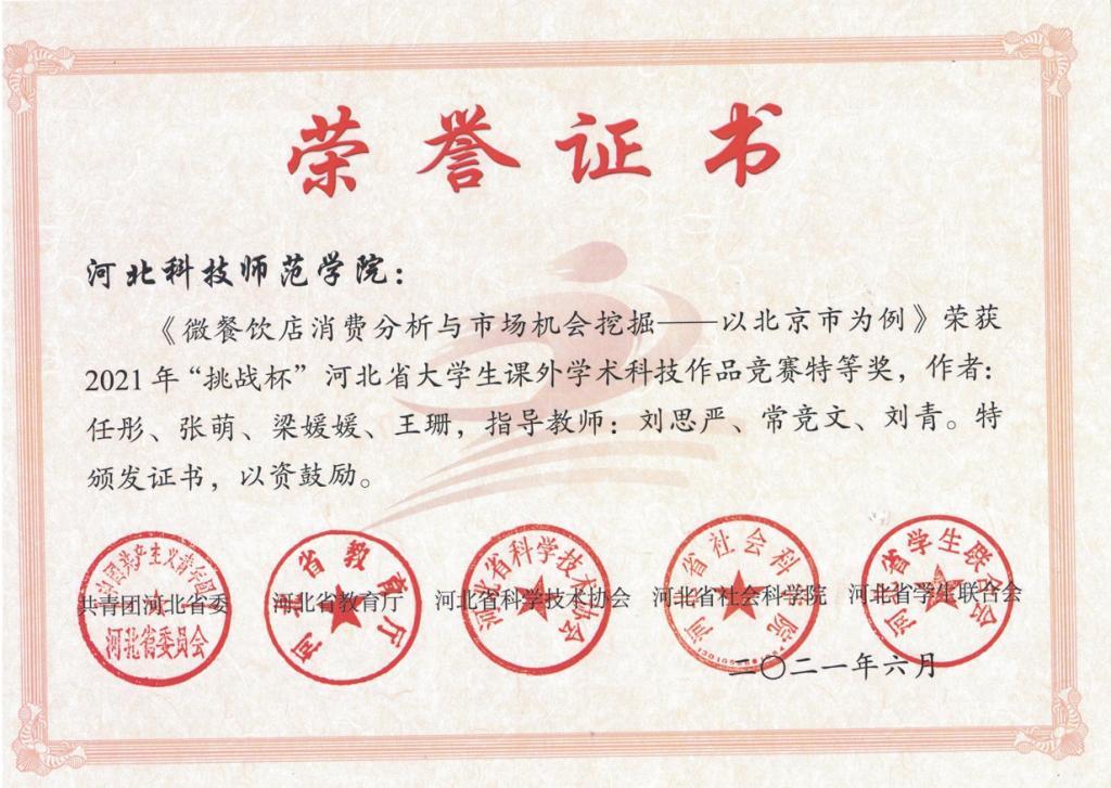 日前,共青团河北省委、河北省教育厅、河北省科学技术协会、河北省社会科学院、河北省学生联合会联合对2021年“挑战杯”河北省大学生课外学术科技作品竞赛获奖结果进行通报。由刘思严、常竞文、刘青指导、应用统计学专业学生任彤、张萌、梁媛媛、王珊等完成的参赛作品《微餐饮店消费分析与市场机会挖掘--以北京市为例》荣获2021年“挑战杯”河北省大学生课外学术科技作品竞赛特等奖,刘思严老师荣获2021年“挑战杯”河北省大学生课外学术科技作品竞赛“优秀指导教师”荣誉称号。