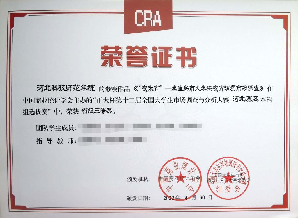 金年会jinnianhuicom2019级应用统计学专业的同学们积极参与2022年度中国商业统计学会举办的“正大杯第十二届全国大学生市场调查与分析大赛河北赛区本科选拔赛”。经过同学们的认真调研与老师们的热心指导,最终共荣获三项省级三等奖。